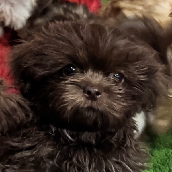 Kit is a rich Chocolate Liver with a white abstract splash on her chest and under her neck. Since she is genetically liver-based, her dark coat will likely clear and transition into a softer cocoa or silver-brown tone as she gets older.