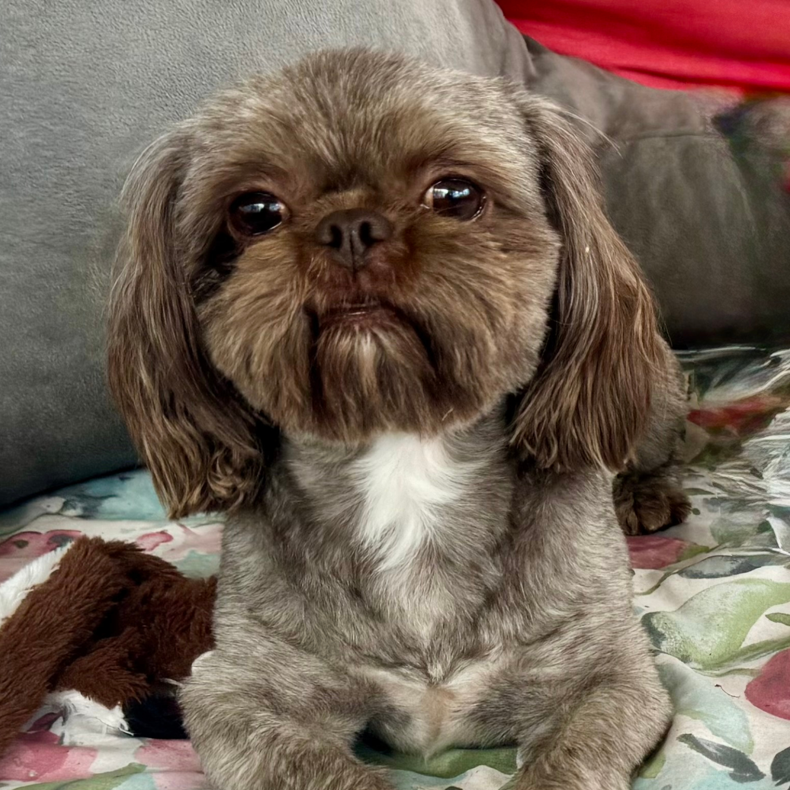 While Bash is a bit of a “throwback” in size compared to his tiny 6 and 8 lb parents, he comes from very small lines and consistently passes those smaller genetics down to his puppies. Bastian not only brings a lot of joy to our home, but great genes to the pups he sires. His absolute cutest quirk? When he wants your attention, he makes this adorable, rumbling “brrrrrrrrrrr” noise! It sounds exactly like he is rolling his R’s or trying to purr like a tiny little motor. It is completely endearing and impossible to ignore!