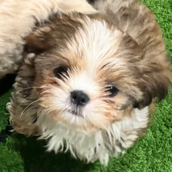 Spumoni is a Gold Sable and White Parti and will likely look like a completely different dog as an adult. As a genetic sable, his dark black tipping will disappear, and his warm gold patches will clear into a soft honey-gold or pale champagne shade. His black pigment will remain dark, providing a sharp contrast to his lightened coat.