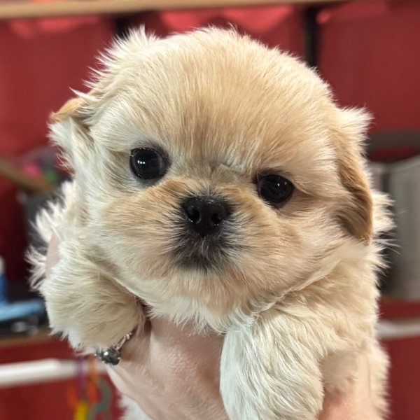 Static is a vibrant Solid Gold male with exceptional pigment. His coat is luminous pale honey-gold from head to tail. While genetically a Sable, he is completely clear of dark shading. This rare “clear” coat gives him a bright, sunny appearance that is highly prized for its uniformity. This stunning gold is anchored by deep, jet-black “leather”—his nose, lips, and eye rims, providing a sharp and beautiful contrast to his light coat.